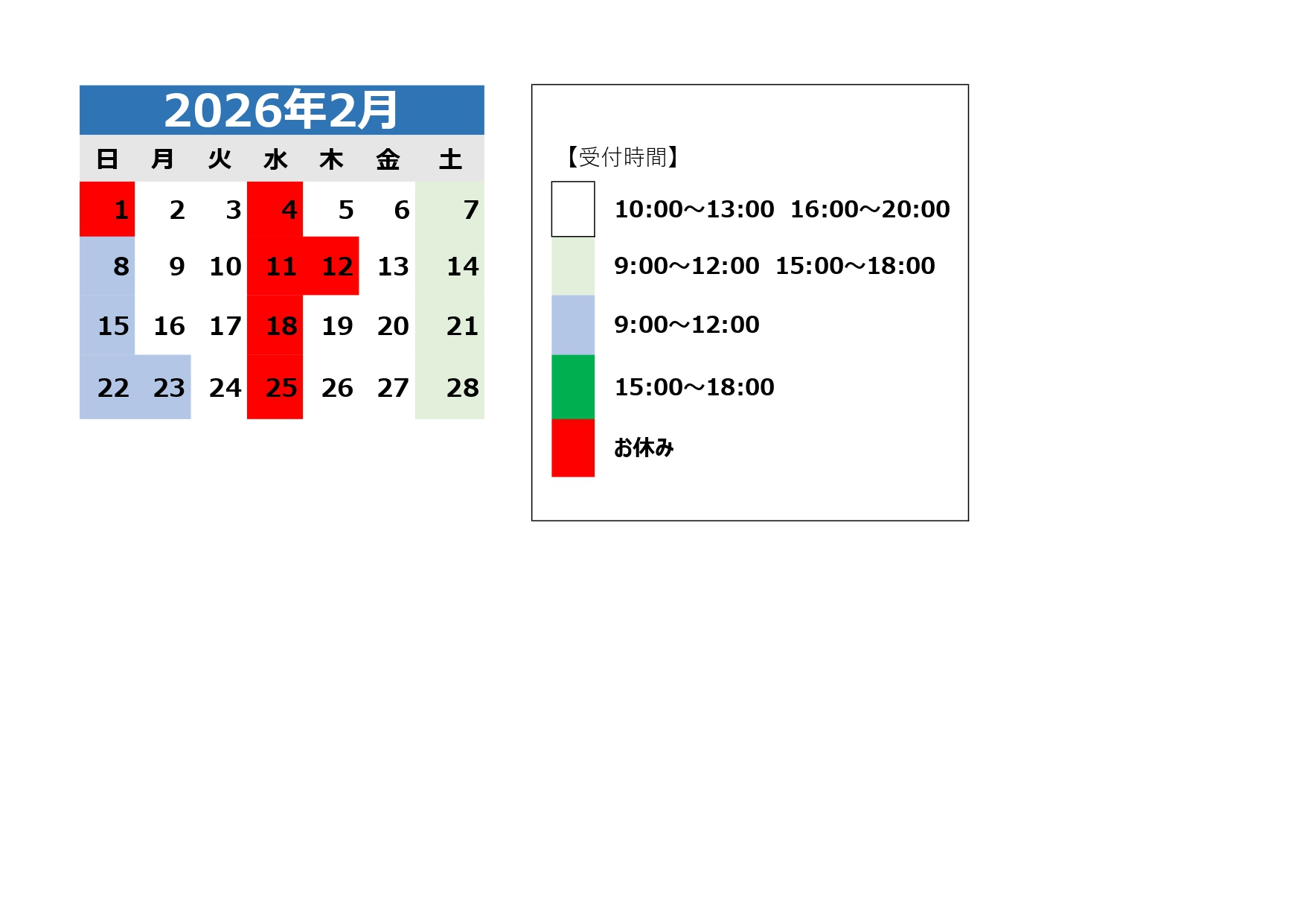 2月営業時間については当院カレンダー通りとなります。