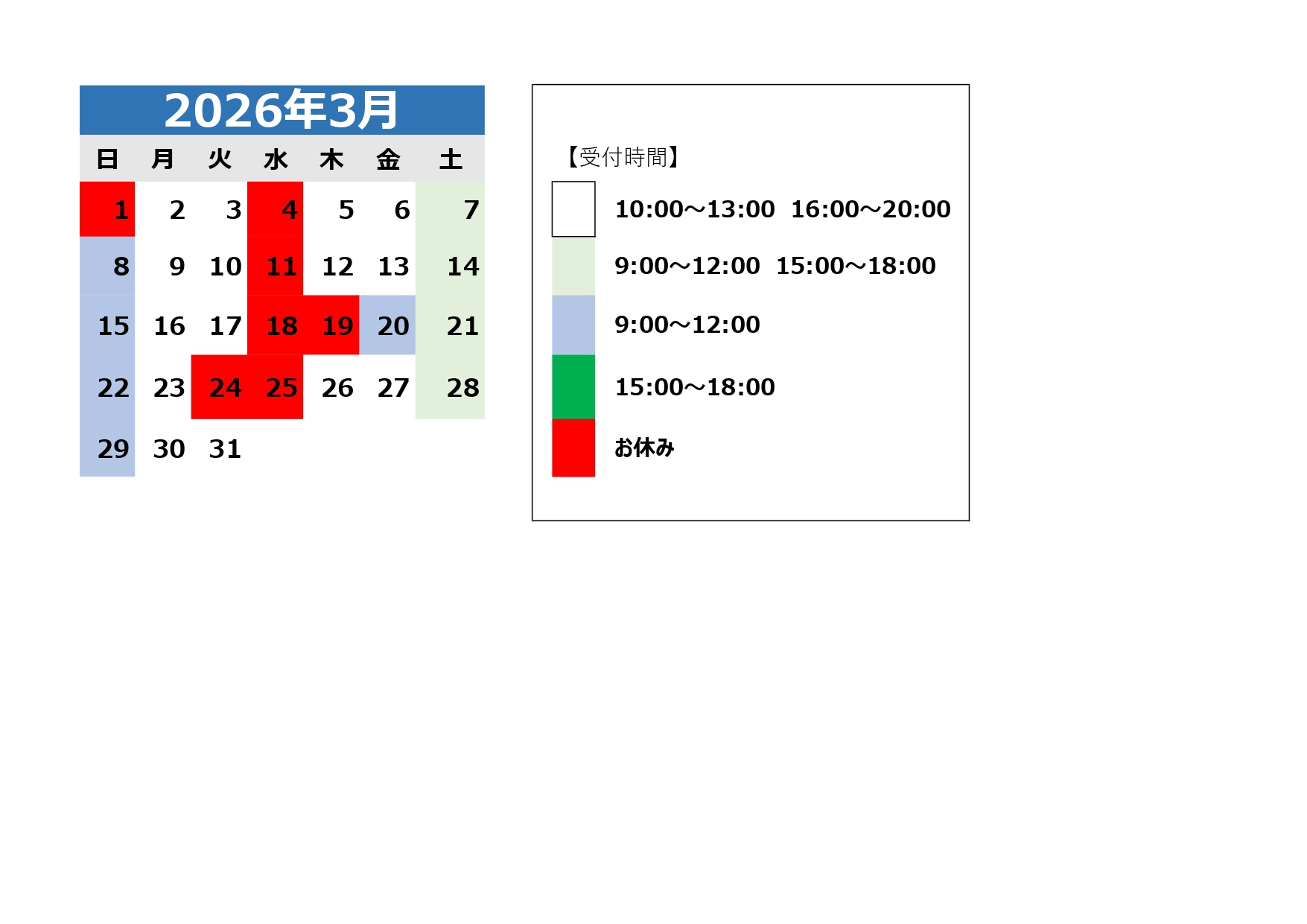 3月の受付時間については添付したカレンダー通りとなります。